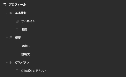 レイヤーに落とし込むと例えば、以下のように、Frame(基本情報・概要・CTAボタン)を入れ子にして組むのが基本です。